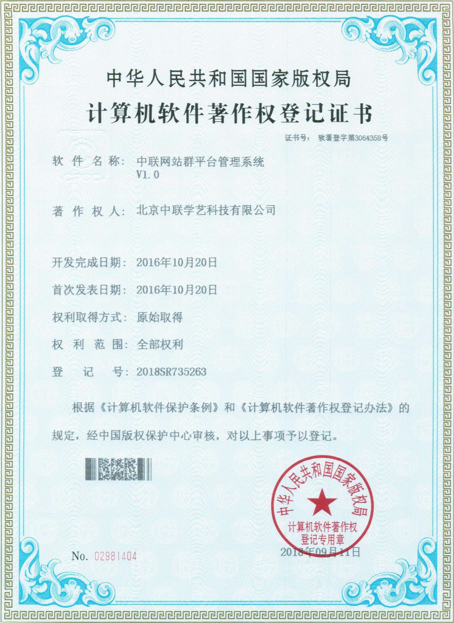 中聯站群系統軟著權證書