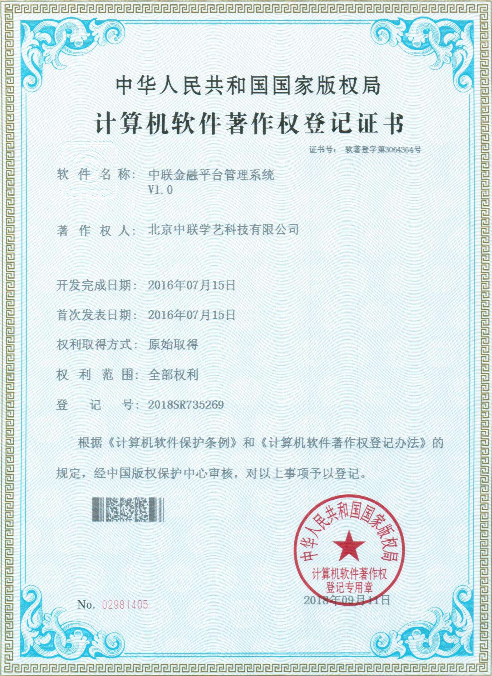 中聯金融系統軟著權證書
