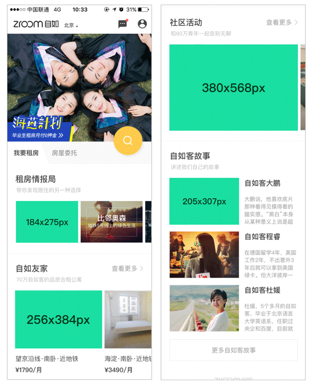 例如自如APP中的圖片,除了BANNER以外的其他圖片,雖然都有大有小尺寸都不同,但是所有的圖片的比例都是一樣的,長寬比例一樣讓我們可以猜想設計師是不是因為為了節(jié)約未來的維護成本,減少做圖及上傳圖片的次數(shù)而這么設計的。