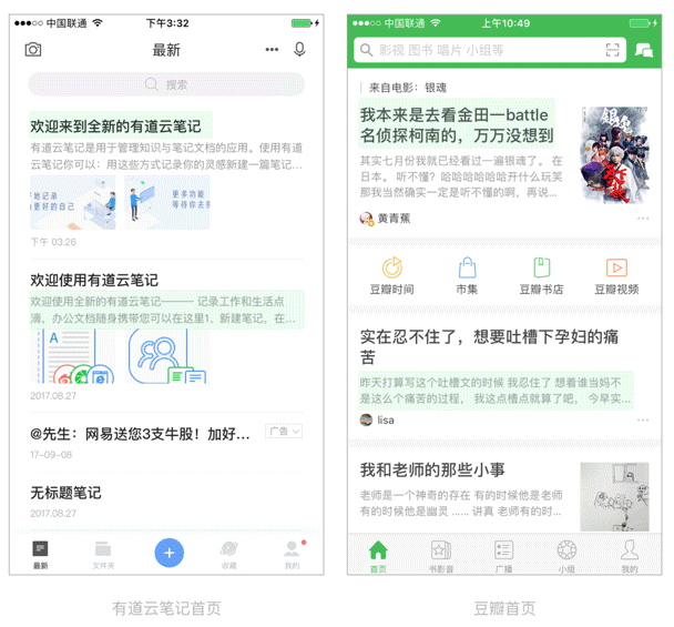 線上很多的APP設計標準大多的字體大小是雙數(shù),而不同大小的字體相差幾乎都是4的倍數(shù),比如下面的有道云筆記的標題為34px而內(nèi)容的標題是26px。還有豆瓣的標題為38px而內(nèi)容的字體大小是26px。除了這些以外,越小的字越不重要,比如時間,比如來源與閱讀量等等。