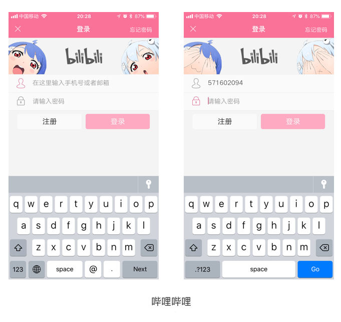 人的肢體語言是很豐富的,而且往往肢體語言比外在的形象更讓人覺得生動,通用性也更強,比如BILIBILI的APP,登錄頁面的UI設計就很擬人化,在登錄頁輸入密碼的時候,頁面上的兩個小人就會無助自己的眼睛。